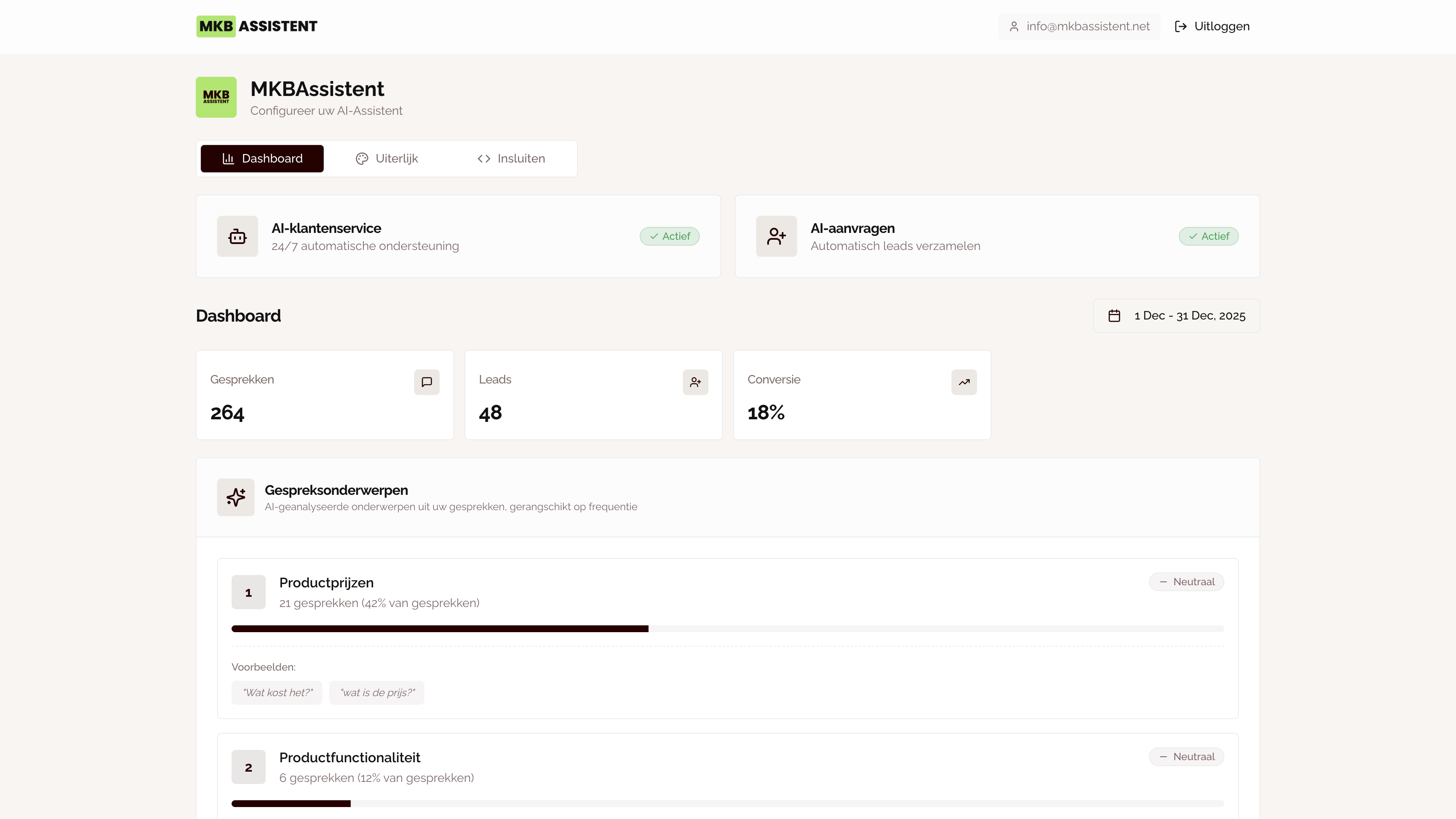 De leadinformatie wordt automatisch doorgestuurd naar uw e-mail. Ook zijn deze inzichtelijk in uw eigen MKBAssistent dashboard, tezamen met alle andere data zodat u precies kunt inzien welke vragen bezoekers hebben.
