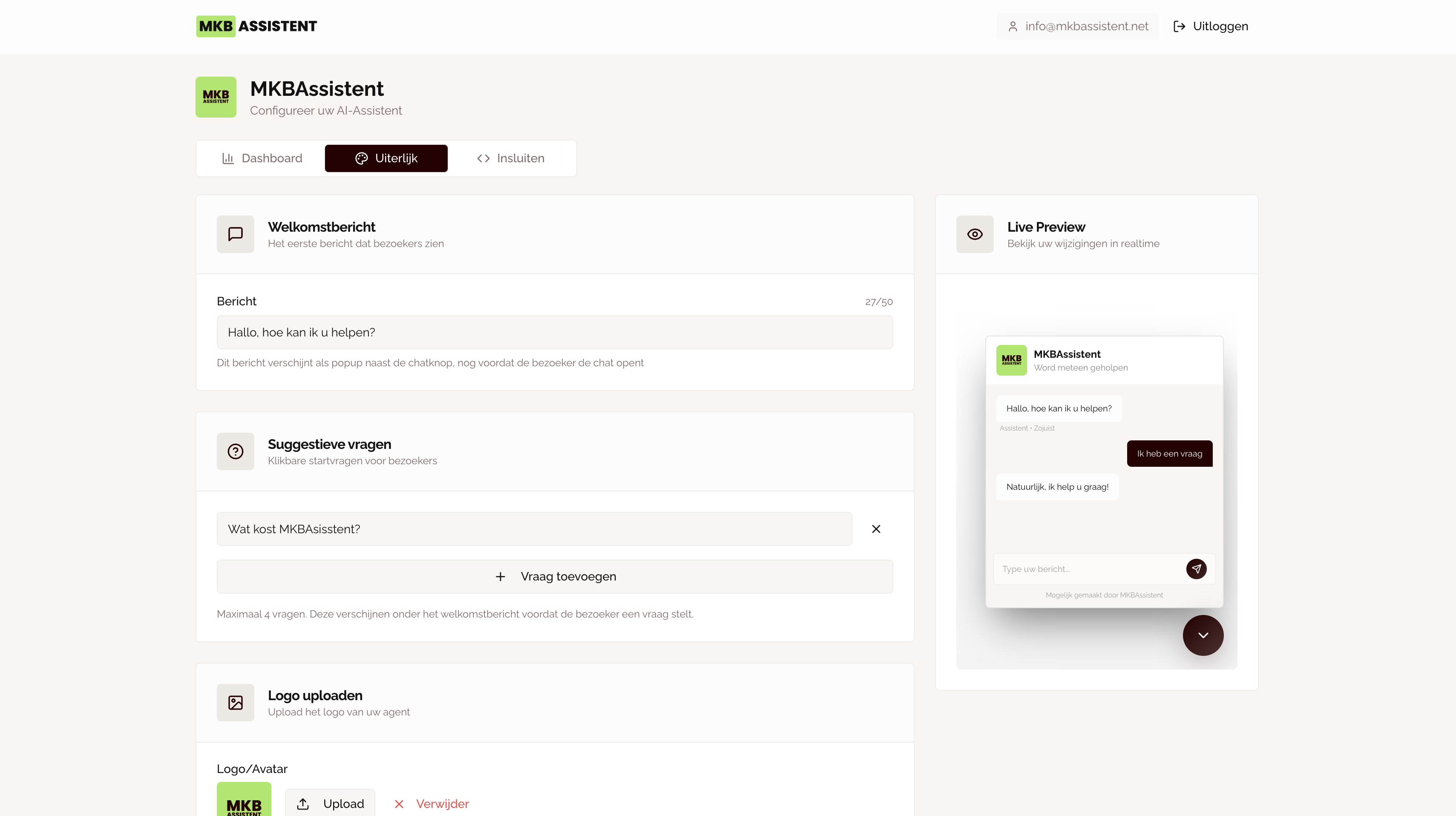 Zeker! Wij zorgen ervoor dat uw kleuren en logo netjes worden overgenomen. Via uw MKBAssistent dashboard kunt u ook zelf kleuren, logo, welkomstbericht etc naar wens aanpassen.